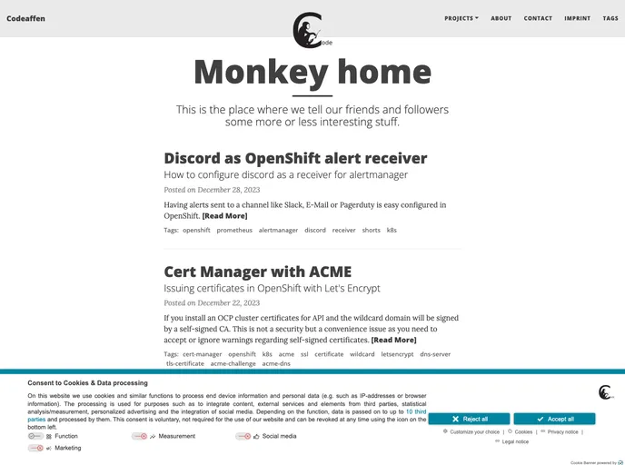 Welcome to our blog system for codeaffen.org. Here, we publish new and interesting articles related to our work as System Engineers or System Architects. Our blog system is powered by Jekyll, a simple and static blog system, and we use the Beautiful Jekyll theme for its aesthetics. With Jekyll, we can create static pages that are blog-aware and support features like permalinks, categories, and custom layouts. The best part is that Jekyll is eligible for free hosting on GitHub Pages, making it easy for us to share our articles with the audience. All articles and posts on our blog are released under the CC BY-NC-SA license.