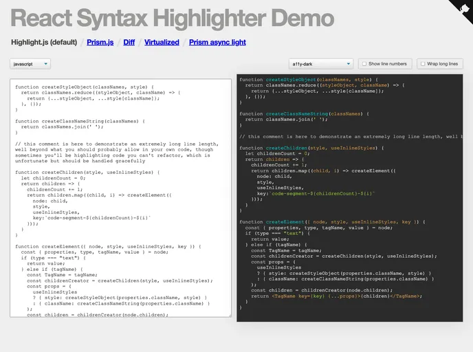 React Syntax Highlighter is a fantastic tool designed for React developers who need a reliable and efficient way to highlight code syntax within their applications. Utilizing either PrismJS or HighlightJS, it allows for seamless integration of syntax highlighting, making code snippets not only readable but also visually appealing. This component is particularly beneficial for developers creating technical documentation, code examples, or educational content.