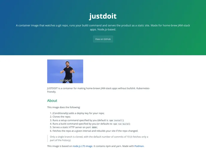 A container image that watches a git repo, runs your build command and serves the product as a static site. Made for home-brew JAM-stack apps. Node.js-based.