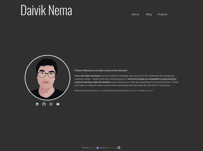 Source code for my personal website. Built with Gatsby and Material UI; the website houses my resume and blog.