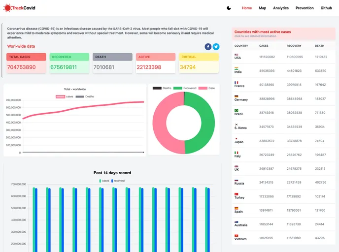 Covid19 tracking web app that shows the up to date data of corona virus distribution around the world.