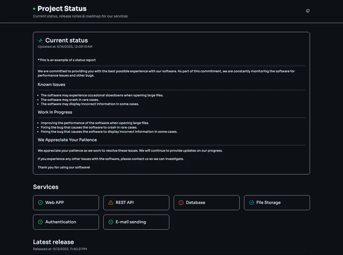 The Project Status theme is a React-based single page application that displays project release notes and status using the GitHub API. It provides integration with GitHub actions for easy deployment and offers multiple methods to trigger the deployment job. With its simple installation process and key features, it is a useful tool for managing project releases and keeping track of project status.