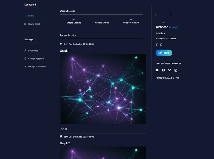 Profile Dashboard: User profile details such as name, email, profile photo, and bio are displayed. Account details including the current subscription plan and status, as well as usage metrics such as graphs created, graphs shared, and papers collected are also shown. A recent activity feed showing recent graphs, collections, and queries is included. Links to Favourites and Collections pages are available.