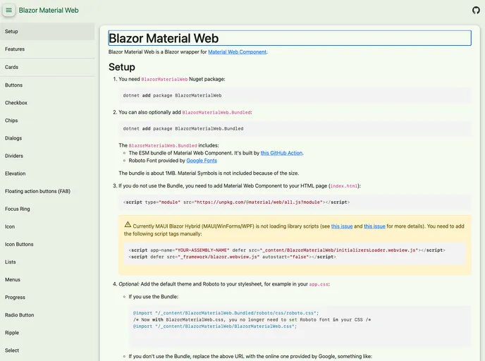 BlazorMaterialWeb is an innovative Blazor wrapper designed to bring the sleek and modern aesthetic of Google's Material Web Components to your Blazor applications. With this tool, developers gain access to a variety of pre-built components that can enhance the user interface of their web applications, making them more intuitive and visually appealing. The seamless integration with the Blazor framework ensures that you can leverage all the power of Material Design while maintaining the rich functionality of Blazor.