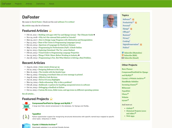 Website 3.0 is the personal website of David Foster. This website serves as an example of a complex Jekyll site structure. It offers various notable features, including breadcrumbs on all pages, clean URLs without file extensions or query parameters, advanced Markdown with footnotes and multi-level bulleted lists, deployment automation to GitHub Pages using git, a tag index for blog posts, and anchor-based header highlighting. The site is built and run inside a Docker container, eliminating the need to manually upgrade Ruby and Jekyll.