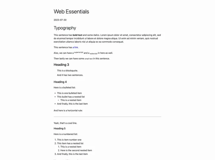 "Web Essentials" is a boilerplate template and style guide that provides the basic HTML and CSS structure for any website. It offers a quick and efficient way to set up the foundation of a website and ensures consistency in styling. The template includes essential meta tags for SEO optimization and offers suggestions for structuring HTML content and styling using CSS.