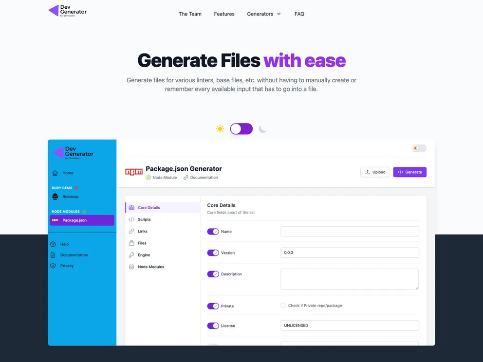 Base website to promote Dev Generator with details about