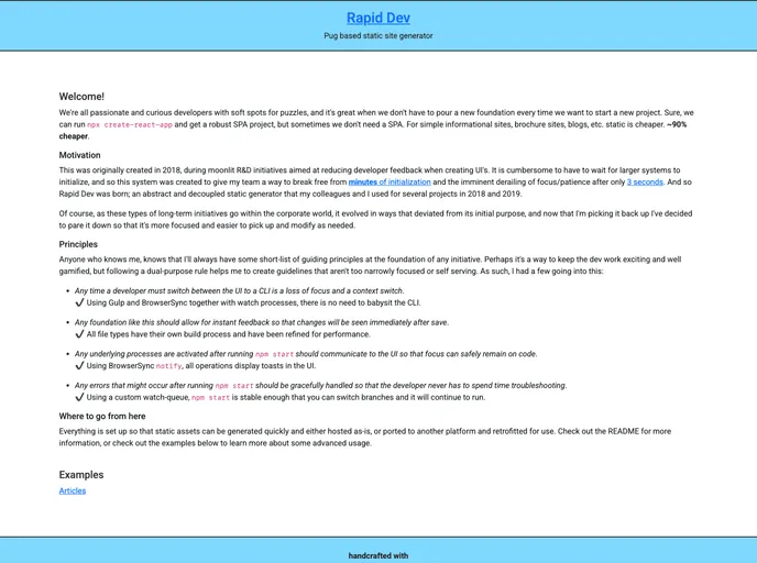 The Rapid Dev Static Site Generator is a collection of development tools and processes that enable developers to prototype UI components quickly. By utilizing features such as browsersync, css streaming, and watch, the code automatically builds and refreshes in the browser with every change made. This dynamic setup allows for a seamless and efficient development environment.