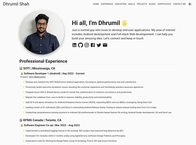 Dhrumil Shah Portfolio Website built using ReactJS, Material-UI, Lottie Animations, and AOS (Animate on Scroll) Library.