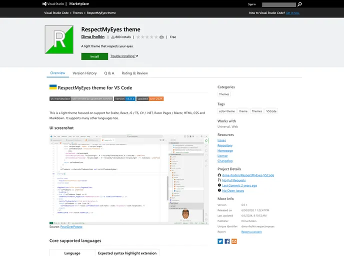 The RespectMyEyes theme for VS Code is a versatile theme that provides support for a wide range of languages and file types. Developed by Dima Iholkin, this theme offers a visually appealing coding environment that helps improve readability and reduce eye strain.