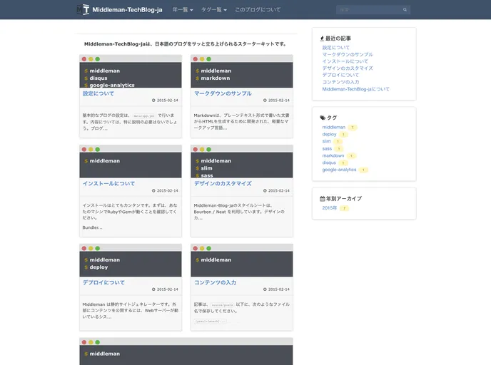 Middleman-Techblog-ja is a project template of Middleman and useful starter kits to help you blogging faster.