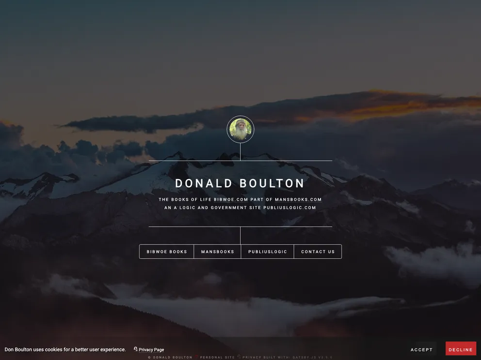 Donald Boulton Personal Portfolio Featuring Gatsby Version 5.12.6. React 18.2.0. One Page Landing Page for Donald Boulton, Linking my other sites mansbooks.com bibwoe.com and publiuslogic.com