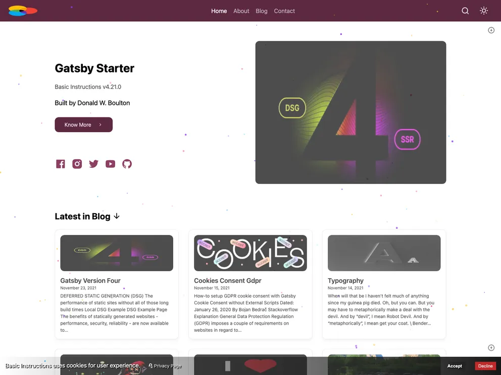 Gatsby Starter, Gatsby v4.21.0. A Template. Built with Theme UI, Uses Dark Mode with Elastic Luna search including image search