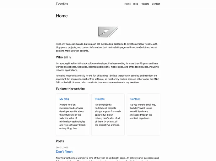 Doodles' website, developed by Eduardo Moraes, is a personal website featuring blog posts, projects, and contact information. The website is built using Jekyll and is currently deployed on Netlify at doodlesdev.netlify.app. The website provides information about Eduardo and showcases his work.