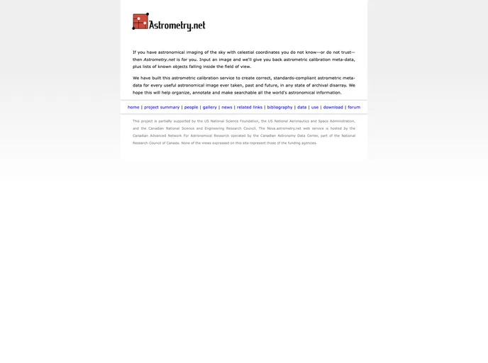 Astrometry.net is an automated service that offers the recognition of astronomical images and provides standards-compliant astrometric metadata from the data. This service is designed for those who have astronomical images of the sky with celestial coordinates they are unsure of or do not trust. By inputting an image, users can receive back astrometric calibration metadata along with lists of known objects within the field of view.