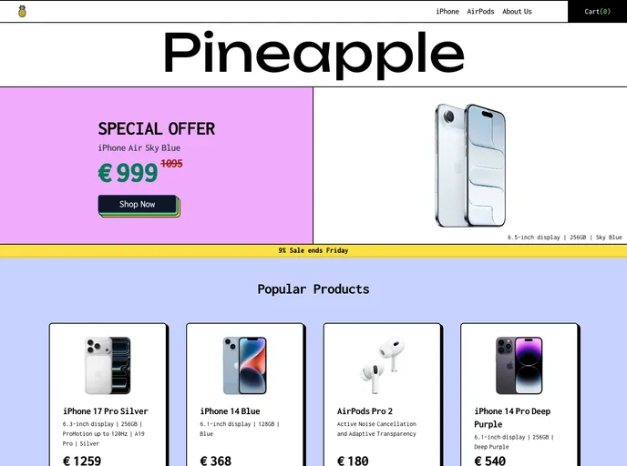 Pineapple ecommerce is an iPhone ecommerce platform built with Next.js, Sanity, and Stripe. It is a work in progress project that allows users to run an ecommerce website locally.