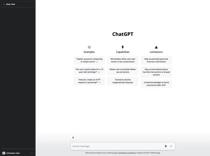 The ChatGPT Clone Website is a replica of the original ChatGPT website, utilizing localStorage features instead of a database to store chat history. The main purpose of this project is for educational purposes.