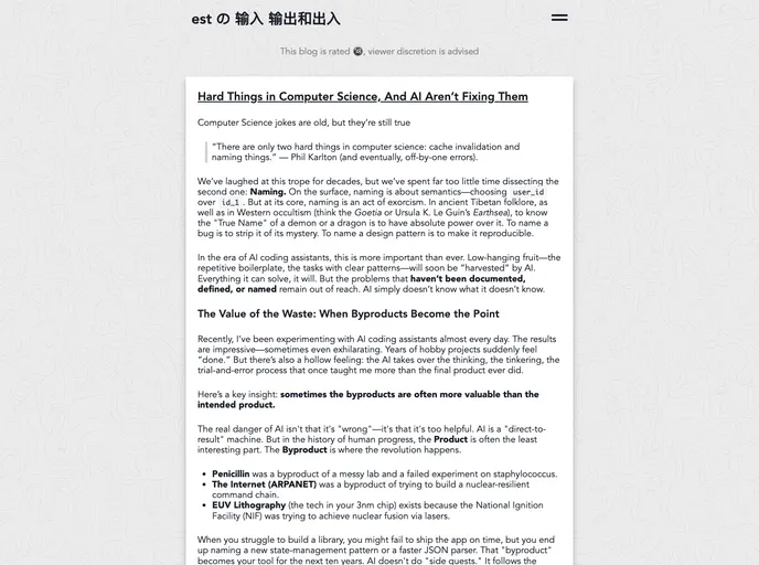 This product analysis focuses on the static site source code for Est's blog, which is hosted at https://blog.est.im/. The blog is built using the Pelican framework with a custom modification of the Aether theme. The code repository contains the necessary files for generating the static site.