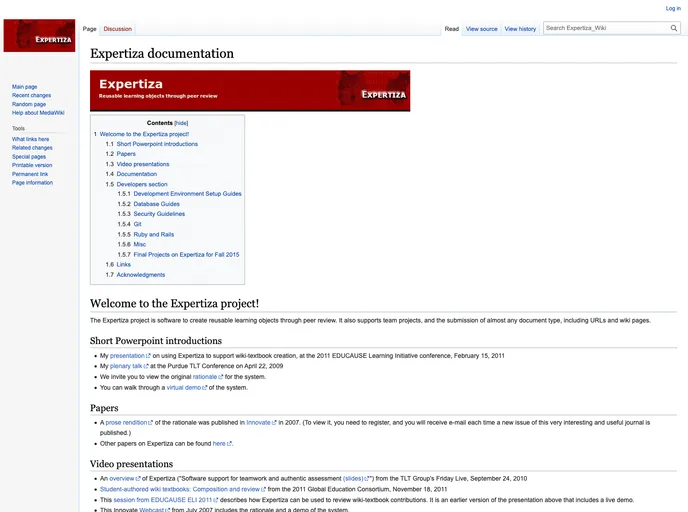 Expertiza is an innovative web application designed for educational purposes, allowing students to submit and peer-review a variety of learning objects such as articles, code, and websites. It has garnered attention for its application in select courses at NC State and other universities, making it a valuable tool in academic environments. The application's setup can be slightly complex owing to the various environments available, but it provides flexibility for users to develop and manage their contributions effectively.