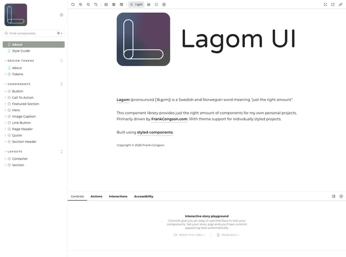 Lagom UI is a component library that provides a balanced set of components for personal projects. The name "lagom" is a Swedish and Norwegian word that means "just the right amount". The library is primarily developed for use on FrankCongson.com and offers theme support for individually styled projects. It is built using styled components and Styled System.