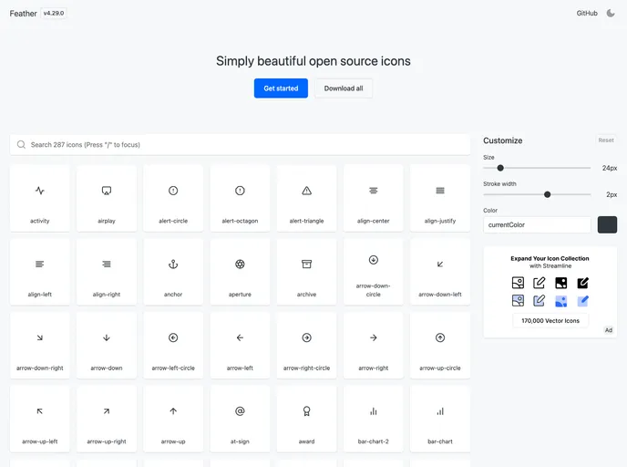 Feather is an impressive collection of open-source icons that boasts a beautifully minimalist design. Built on a uniform 24x24 grid, each icon exemplifies simplicity, consistency, and a strong attention to detail, making them ideal for modern web applications and projects. Whether you're a developer looking to enhance your project or a designer wanting to keep things clean and stylish, Feather offers an extensive range of icons to suit any need.