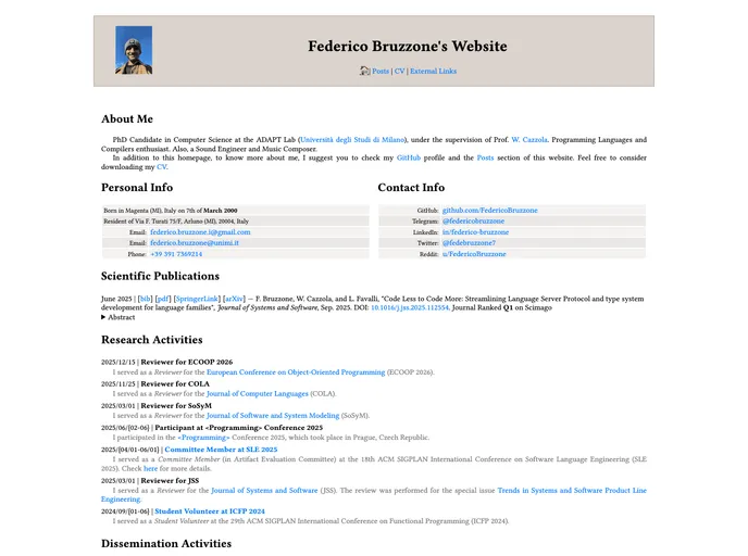 Federico Bruzzone's personal website serves as a platform to showcase his passion for computer science. It provides detailed information about his background, projects, and blog posts. The website also includes a contact section where visitors can reach out to Federico for inquiries or collaborations.