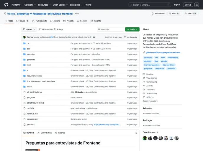 Este repositorio no solo se centra en las preguntas típicas de entrevistas, sino que también incluye categorías variadas como HTML, JavaScript, CSS, y rendimiento. Además, se fomenta la participación activa de los usuarios, lo que asegura que las preguntas sean relevantes y actuales.