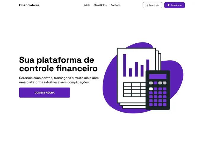 Sua plataforma de controle financeiro. Gerencie suas contas, transações e muito mais com uma plataforma intuitiva e sem complicações.