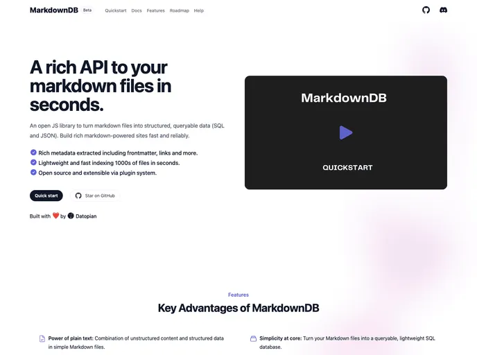 MarkdownDB is an innovative JavaScript library designed to transform markdown files into a structured and easily queryable database, leveraging both SQL-based formats and simple JSON. For anyone looking to create a rich, markdown-powered website or application, MarkdownDB offers a reliable solution that streamlines the process of data management from markdown content. With its intuitive structure and lightweight API, it's user-friendly and suitable for developers of all skill levels.