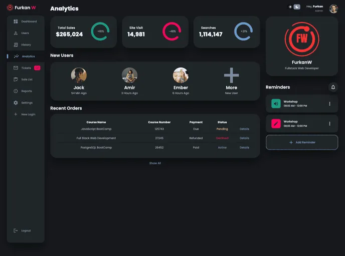 Advanced Reporting: The dashboard provides comprehensive and visually appealing reports on various metrics, such as user activity, sales data, and website performance. These reports can be customizable and exported for further analysis.