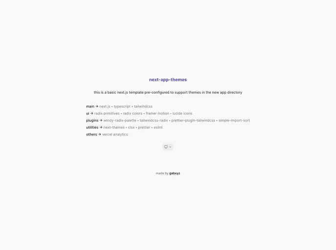 The "next-app-themes" is a basic Next.js starter template that comes with theme support in the new app directory. It utilizes various technologies and packages such as Next.js, Typescript, TailwindCSS, UI Radix, Primitives, Colors, Framer Motion, Lucide Icons, and more. The template provides a convenient solution for implementing themes in Next.js applications.