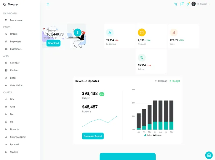 A dynamic admin dashboard built with React, Tailwind CSS, and Syncfusion components. Featuring 16 pages, customizable themes, and responsive design, it's a showcase of frontend expertise for company operations management.