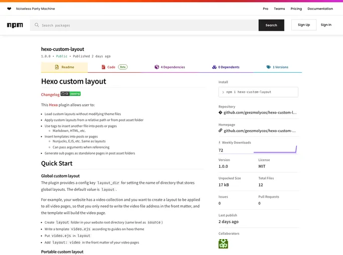 Hexo plugin that allows loading custom layouts without modifying theme. Also provided useful tags for including snippet files and small templates.