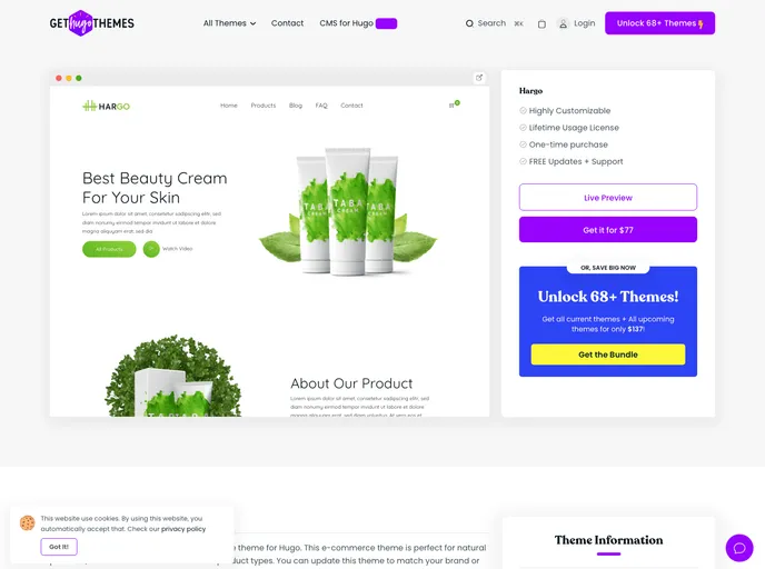 Hargo is an E-commerce theme powered by Hugo and Snipcart. It's fully functional, users can order items and also payments throw this theme.