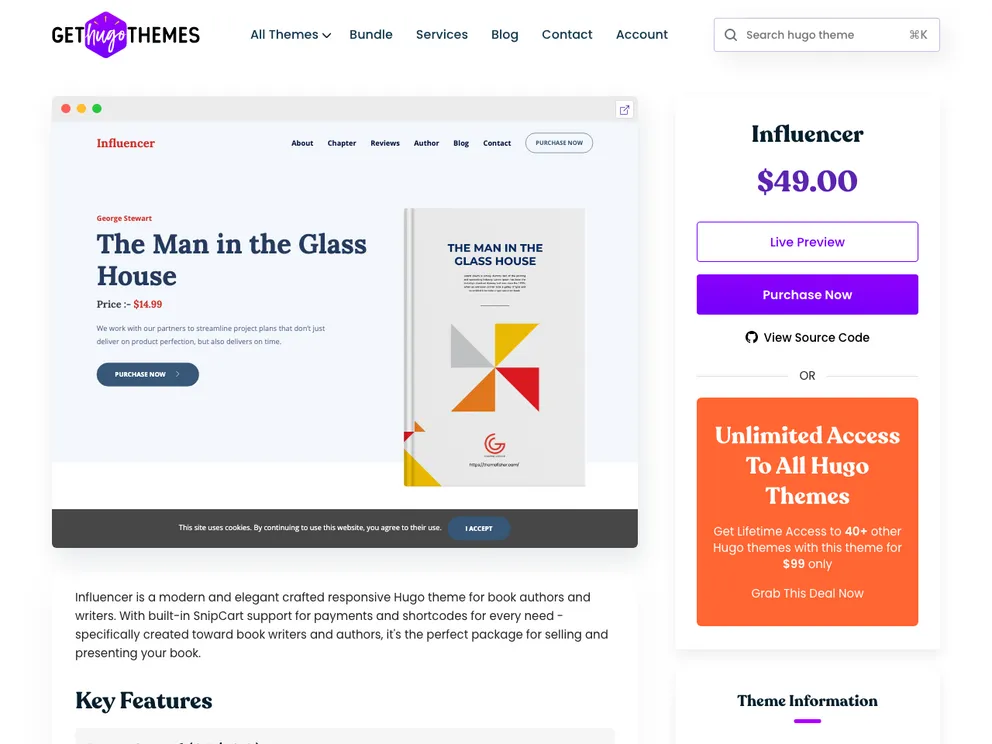 Influencer is a Hugo theme for book authors and writers. It has also Snipcart supports for order books and payments.
