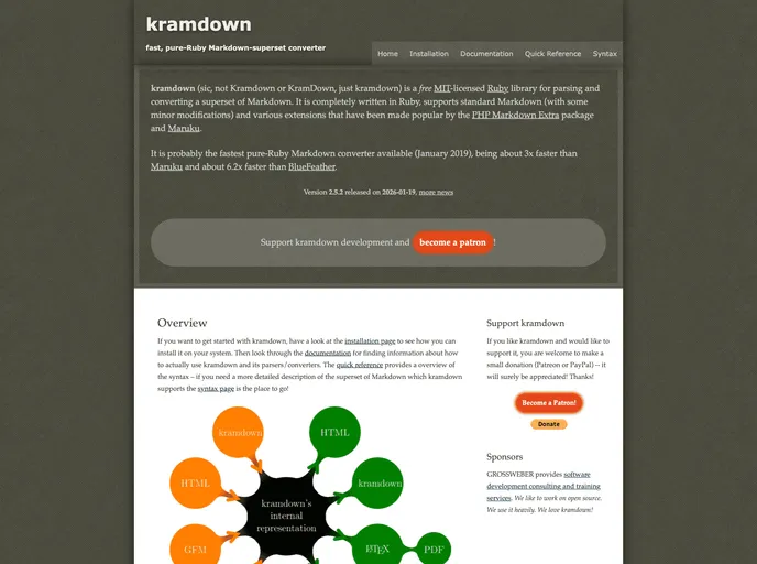kramdown is a robust and efficient Markdown superset converter, primarily developed in Ruby. Released under the MIT license, it allows for easy integration into both personal and commercial projects. With a focus on a strict syntax definition and multiple extensions, kramdown stands out as a powerful tool for translating Markdown into various formats, including HTML and LaTeX. Its flexibility makes it an appealing choice for developers looking to enhance their documentation and content creation workflows.