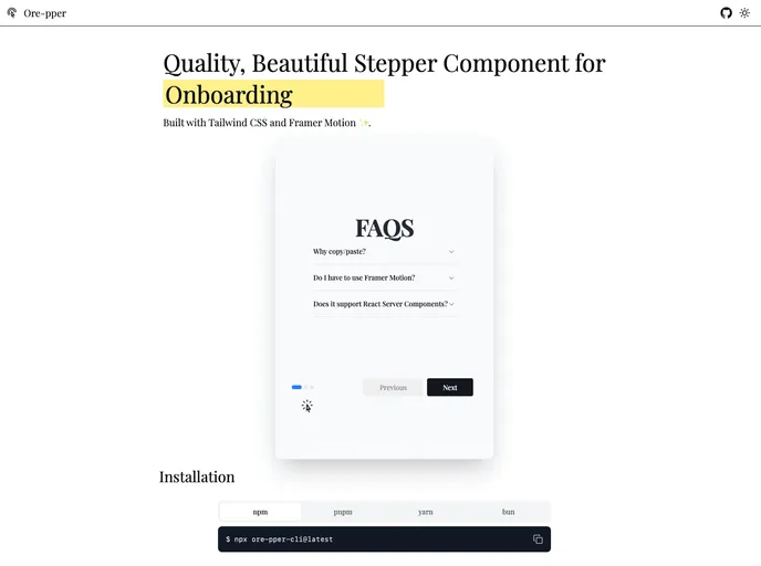 ore-pper is a convenient and customizable Stepper component for React apps. It offers seamless integration with Tailwind CSS and optional support for Framer Motion animations. The CLI tool makes it easy to set up the component in your project, and the landing page provides information and examples of how to use it effectively. Overall, ore-pper is a useful tool for developers looking to add Steppers to their React applications.