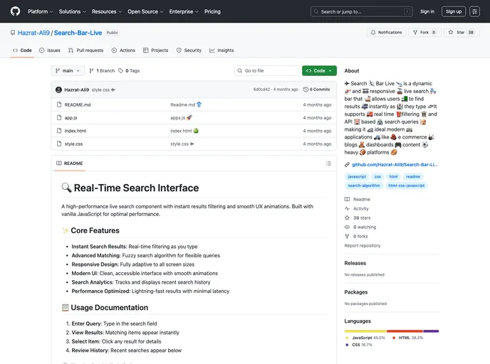 The Real-Time Search Interface is an impressive live search component designed for high performance and user satisfaction. Built using vanilla JavaScript, it delivers instant results while ensuring a smooth user experience with minimal latency. With its modern design and advanced features, this interface is ideal for developers looking to enhance search functionalities in their applications.