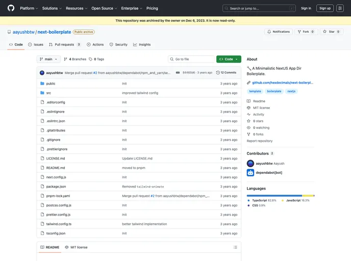 The NextJS Boilerplate is a minimalistic template designed for the NextJS framework. It is a modified version of shadcn's next template, with all credits going to him. The boilerplate aims to provide a basic starting point for NextJS projects, allowing developers to quickly set up their development environment and get started with building their applications.
