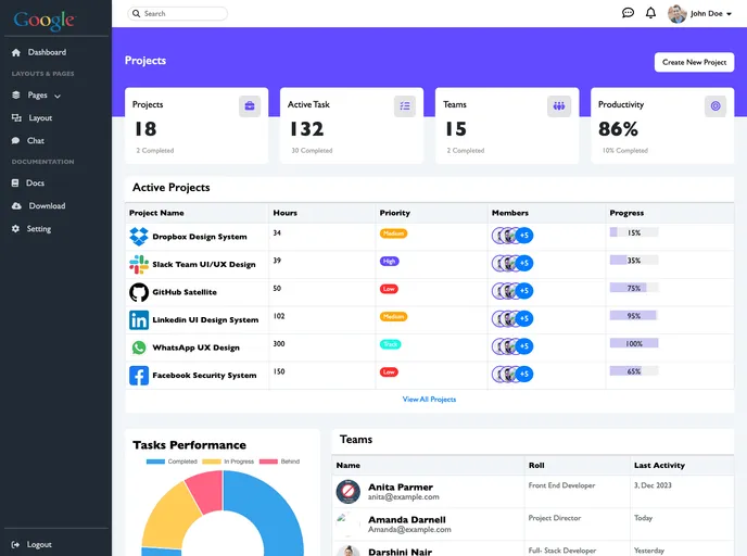 Explore this demo dashboard made with HTML, CSS, and JavaScript. It showcases team details, charts, and project info, with a fixed navbar for easy navigation. Fully responsive with Bootstrap, it's easy to use and perfect for learning or showcasing your own projects!