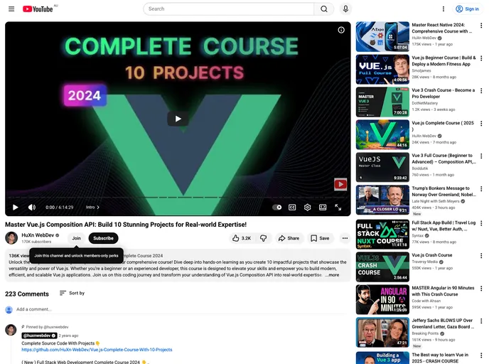 The content is about a complete course on Vue.js with 10 projects.
