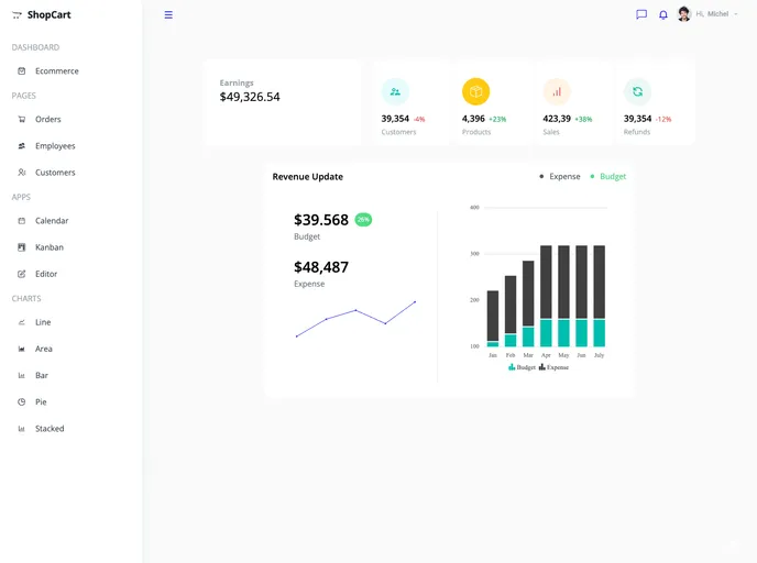 Shopcart Admin Dashboard is a responsive e-commerce admin dashboard built using ReactJS and Syncfusion Elements. It includes an e-commerce page, customer management, order tracking, employee management, a calendar app, a kanban app, an HTML editor, and five charts for data visualization...