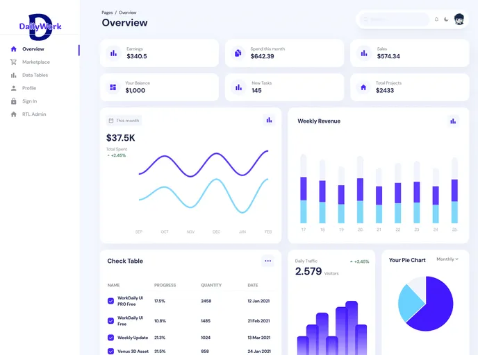 WorkDaily UI is a modern and innovative Open Source Admin Template designed for those who value modern UI elements and beautiful websites. With hundreds of elements, designed blocks, and fully coded pages, WorkDaily UI is ready to help users create stunning websites and web apps. It saves users countless hours of trying to create and develop a dashboard from scratch. This template is built with Tailwind CSS and React, making it the fastest, most responsive, and trendiest dashboard for Tailwind CSS.