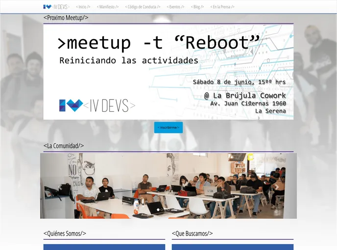 Sitio web de la comunidad IV Devs, Incluye Blog, manifiesto, código de conducta, en la prensa y nuestros eventos