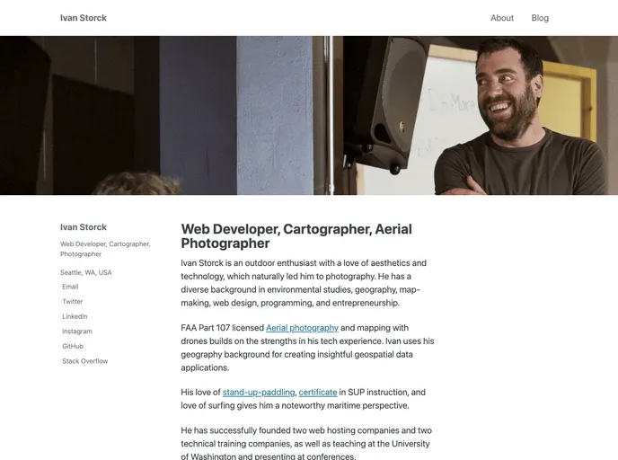 This personal homepage serves as a platform for the author to share their biography and blog posts. The website primarily focuses on technical content and is built using Jekyll, a static site generator, and utilizes the Minimal Mistakes theme. Additionally, the author mentions two other websites, storckphotos.com for photos and paddling goodpaddle.com, presumably for paddling-related content.