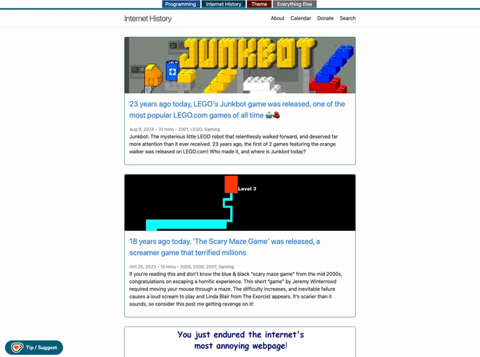 Internet History is a collection of deep dives into the history of the internet. It offers a comprehensive exploration of various aspects of the internet's evolution and development over time. Users can access posts and blog source code on the website to gain insights into the significant milestones and key players in the history of the internet.