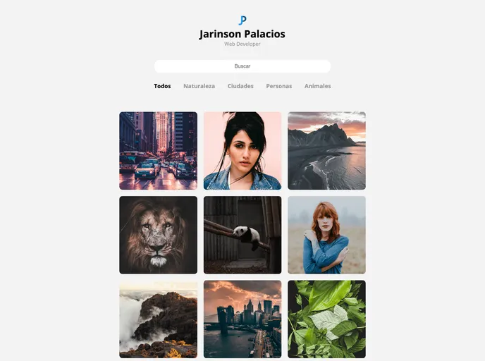 Portafolio de fotos en cuadrícula con HTML, CSS y JS, con barra de búsquedas.