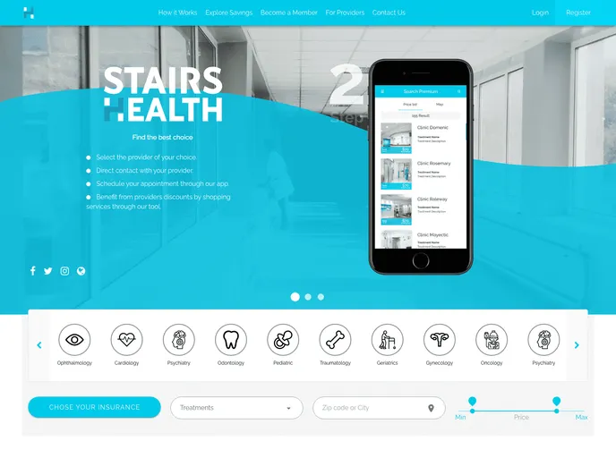 Maquetado de sitio web Stairs Health, desarrollado bajo el framework de Javascript para interfaces progresivas VueJs y el framework de componente de material design Vuetify