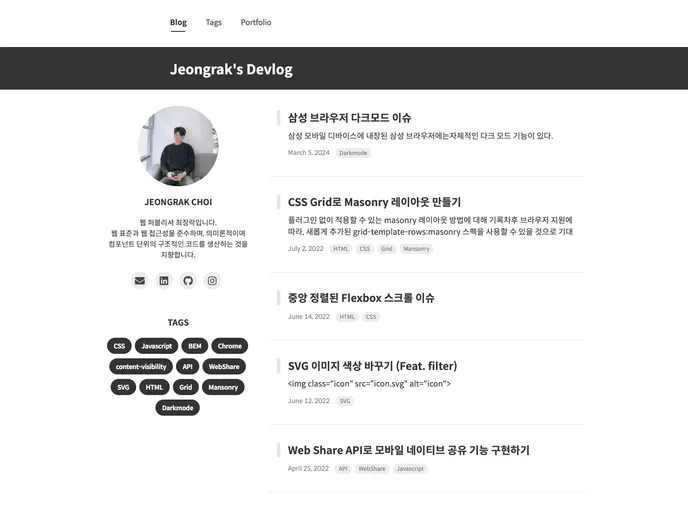 This product is a personal portfolio and blog site developed by Jeongrak Choi. It serves as a showcase for Jeongrak Choi's work and also includes a blog section. The website can be accessed at https://jeongrakchoi.github.io/.