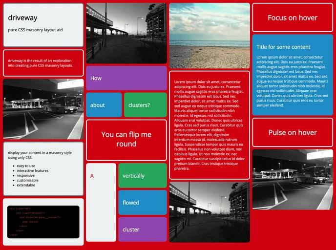 Driveway is an innovative project designed to implement pure CSS masonry layouts effortlessly. Ideal for developers looking to enhance the visual appeal of their web pages, Driveway allows users to focus on content arrangement without having to delve too deeply into aesthetic elements. By utilizing Flexbox and multi-column layout properties, Driveway enables a responsive and interactive experience, making it a versatile solution for modern web design.